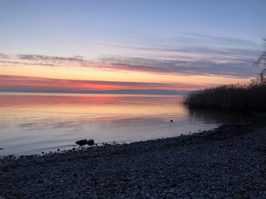 Die letzten Stunden bis zum Sonnenaufgang erweisen sich schließlich als die härtesten der Tour. Die Extremitäten waren mittlerweile vollkommen blutleer. Jetzt weiß ich wieder weshalb ich sonst bei diesen Temperaturen lieber auf der Rolle schwitze. Als um 6 Uhr der erste Supermarkt öffnet, nutzen wir die Gelegenheit uns nochmals aufzuwärmen. Also erstmal 30 min durch die Gänge des kleinen Marktes spazieren und ein bisschen Schoki naschen. Belohnt wurden wir dafür im Anschluss mit einem wunderschönen Sonnenaufgang über dem Bodensee.