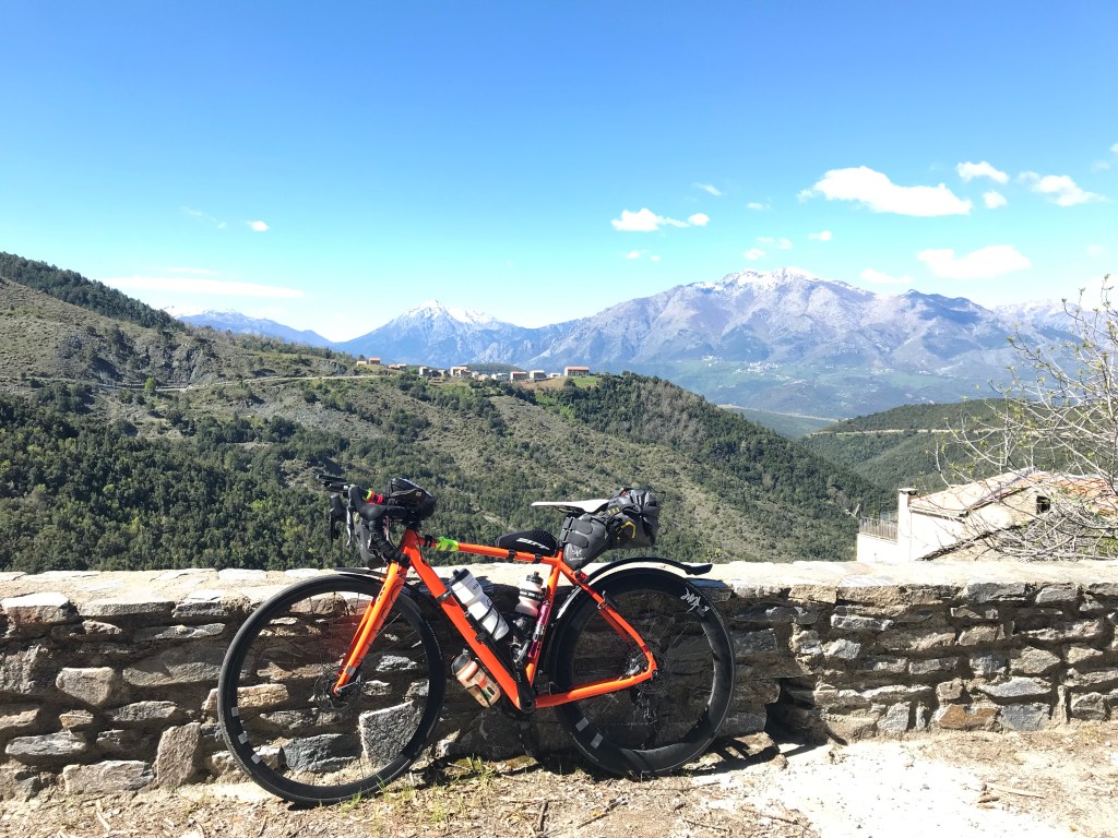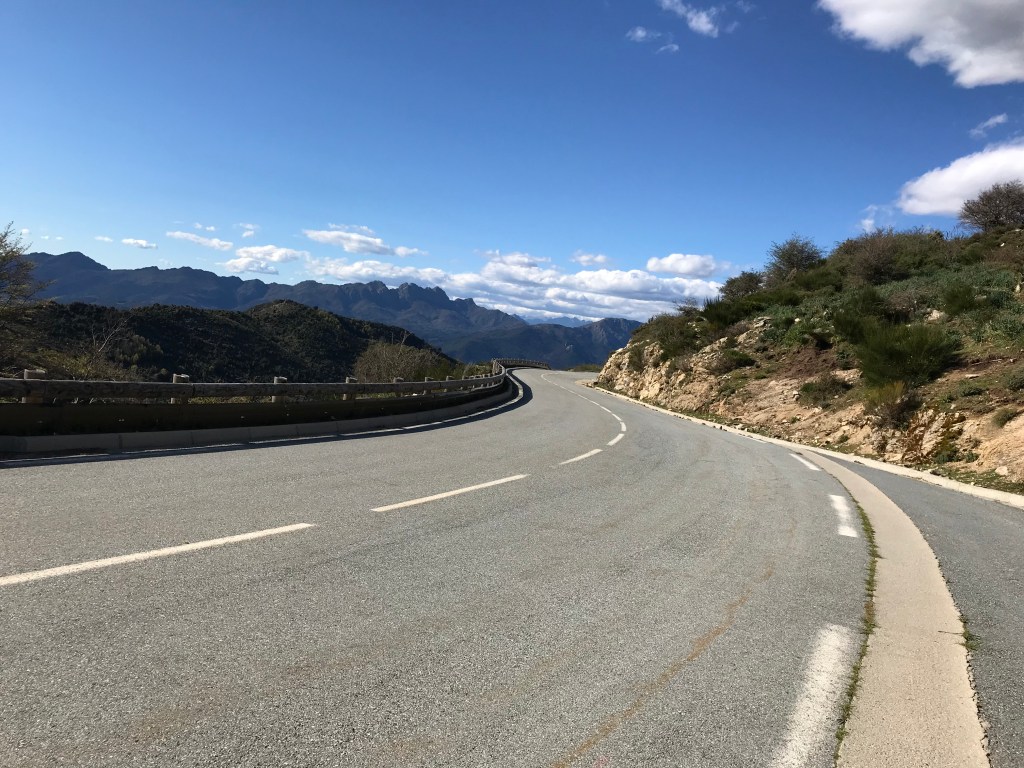 Am ersten Checkpoint genehmige ich mir erstmal eine längere Pause. Zum Speicher auffüllen gibt es ein großes Stück Lasagne, eine Orangina und endlich das erste Käffchen des Tages. Mit meinen Pausenzeiten bin ich diesmal sehr zufrieden. Auch im Bikepacking Modus hat sich scheinbar die nötige Routine eingestellt. Zuerst das Navi aufladen, kurz lockern. Dann ist der Puls schon im Komfortbereich, wenn man etwas isst. Und als letztes kurz frisch machen und die Verpflegung für den nächsten Abschnitt sortieren. So geht es dann nach einer knappen Stunde weiter in den Nationalpark. Die Luft im Vorderrad ist etwas knapp, aber ein freundlicher WoMo Fahrer kann mir unterwegs mit einer Standpumpe aushelfen. Bei korsischen Strassenverhältnissen sind 6 Bar aber auch völlig ausreichend. Die nächsten 140 km bis zum CP 2 in Ajaccio geht es durch den Nationalpark. Einige Kilometer kann ich zusammen mit Xavier aus Belgien fahren, sodass die Zeit hier wie im Flug vergeht. Zwar scheint die Sonne, aber die Temperaturen steigen selten über 12 Grad. Abgesehen von ein paar Stündchen am frühen Nachmittag ist daher leider nichts mit kurz / kurz.