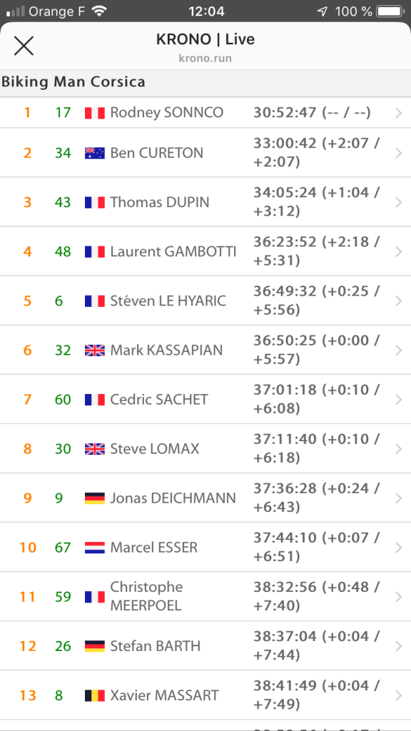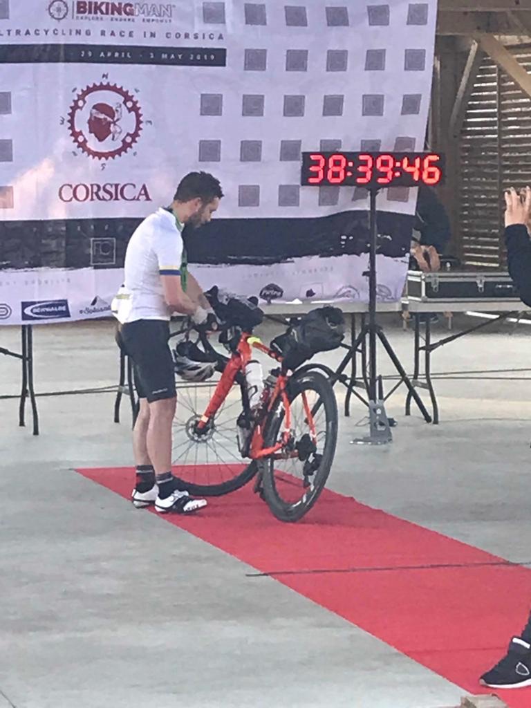 Als plötzlich hinter mir laut der Ruf „Barthsman“ ertönt und Eva, Marie und David mir einen Besuch abstatten, ist die Motivation nach einer kurzen gemeinsamen Pause noch grösser. Das hilft dann auch die scheinbar endlosen Schleifen am Cap Corse zu überstehen. Aber an Tempo habe ich scheinbar doch eingebüßt. Vielleicht auch weil mein selbst gestecktes Ziel von 40h zu diesem Zeitpunkt nicht mehr in Gefahr war. Auf jeden Fall war ich etwas überrascht als plötzlich Deniz an mir vorbeifährt. An Konversation war dieser leider nicht interessiert und ich bekam nur eine mürrische Antwort „it’s a competition“. Aber na gut, dann ist’s halt ne competition. Am Ende konnte ich ihm fast 30min auf 60km abnehmen. Bei Xavier war das schon schwieriger. Dem hat seine Pause in der Nacht scheinbar sehr gut getan und er hat auf dem letzten Abschnitt einfach mal die viert schnellste Gesamtzeit hingelegt. Entsprechend schnell schoss er von hinten an mir vorbei. Da ich aber noch im Rennmodus war, hielt ich dagegen und konnte dran bleiben. Es folgen zwei weitere Attacken, aber absetzten funktioniert nicht. Also fahren Xavier und ich wieder ein Stück plaudernd nebeneinander her. Für uns beide steht fest, dass es auf jeden Fall keinen Sprint auf der Zielgeraden in Bastia geben soll. Ca. 20 km vor dem Ziel dann der entscheidende Angriff. Begonnen von Xavier, aber ich kann bei leichter Steigung noch einen drauflegen und setzte mich ab.