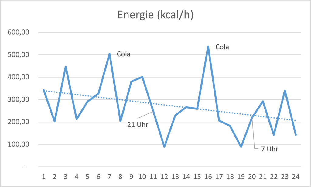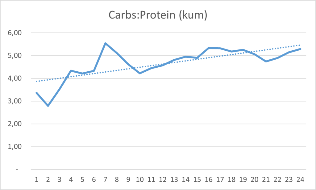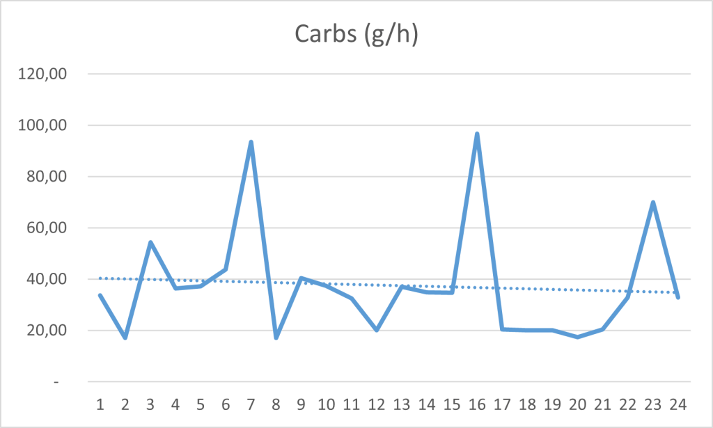 Als Beispiel kannst du dich an den nachfolgenden Graphiken orientieren. Dabei handelt es sich um die von mir dokumentierte Ernährung bei einem Bikepacking Everesting in 24 h. Dazu gibt es auch ein ausführliches Video auf YouTube, wo ich das Ernährungskonzept nochmals erkläre.