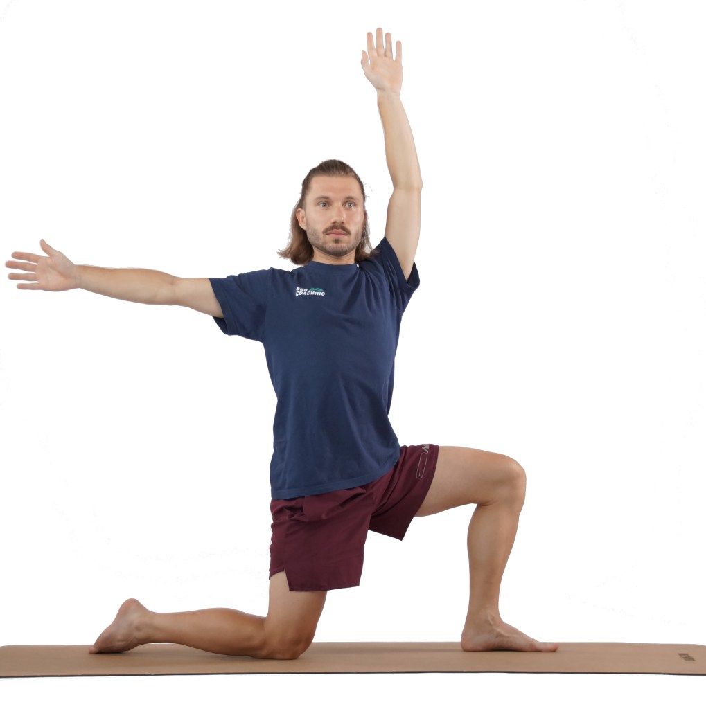 - Ausgangsposition: Gehe in den Kniestand und stelle ein Bein nach vorne auf. Der Arm auf der Seite des aufgestellten Beins wird nach oben ausgestreckt, der andere zur Seite.