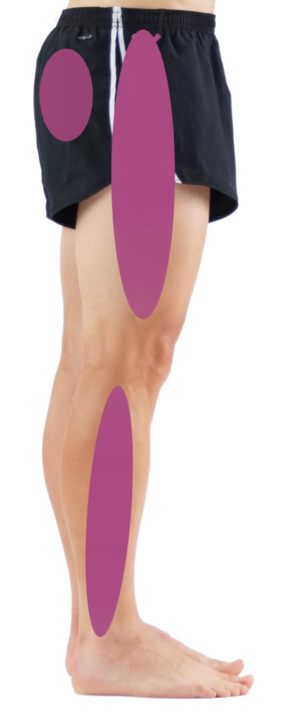 Besonders der Bereich des mittleren Gesäßmuskels und des Schenkelbindenspanners sollte regelmäßig bearbeitet werden. Die nachfolgenden Abbildungen zeigen dir die Punkte, wo du die Akupressur anwenden solltest (Kreuz) und das typische Gebiet der Schmerzausstrahlung (farbige Fläche).