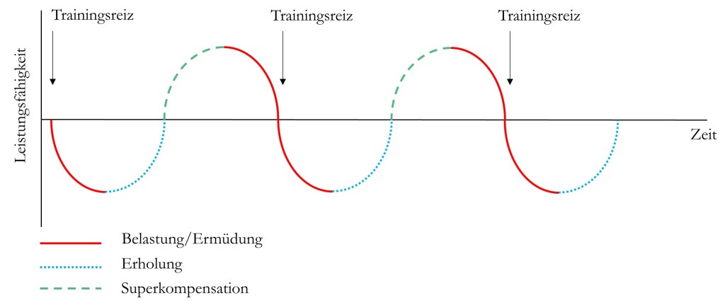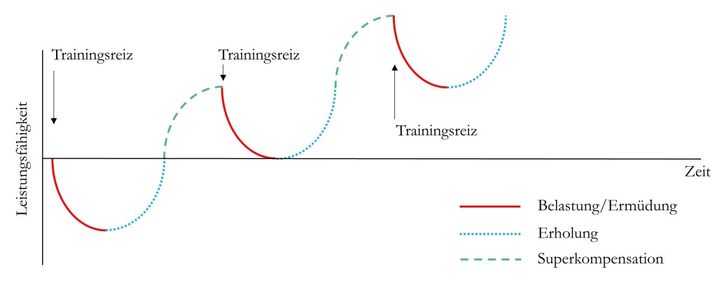 Die optimale Balance zwischen Belastung und Regeneration ist daher entscheidend, um Fortschritte zu erzielen. Denn nur dann kommst du zu dieser schönen Superkompensationskurve: