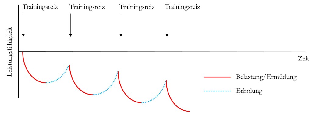 - Belastung: Nach einem intensiven Training sinkt deine Leistungsfähigkeit zunächst. Die Energiespeicher sind erschöpft, Muskeln und Gelenke beansprucht.